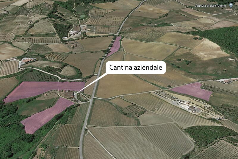 Le vigne Pianacci si trovano a circa un chilometro da Castelnuovo dell'Abate. Sono i vigneti più importanti per estensione e devono il loro nome in quanto attigui alla nuova cantina. Come si vede nella mappa in basso a sinistra la cantina è in mezzo a due vigne, di là dalla strada si trovano altri due vigneti, poco più avanti, sulla destra, si scorge l'Abbazia di Sant'Antimo.