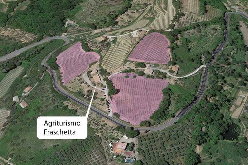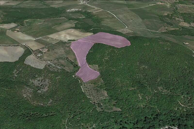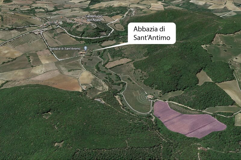 Le vigne Pianacci si trovano a circa un chilometro da Castelnuovo dell'Abate. Sono i vigneti più importanti per estensione e devono il loro nome in quanto attigui alla nuova cantina. Come si vede nella mappa in basso a sinistra la cantina è in mezzo a due vigne, di là dalla strada si trovano altri due vigneti, poco più avanti, sulla destra, si scorge l'Abbazia di Sant'Antimo.